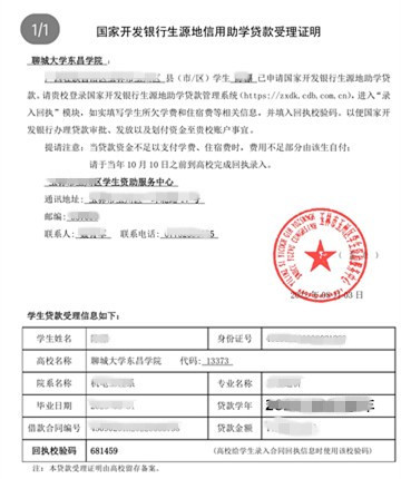 学生在贷款当地办理完助学贷款后,点击【助学贷款申报】-【立即申报】;填写申报贷款金额,点击【下一步】;提交加盖当地公章的该学年贷款受理证明或短信验证消息图片(如下图示例);点击【提交审核】。自提交申请三个工作日之内请登录系统查询审批结果,如审核通过,账单自动减去生源地贷款金额(冲减的贷款金额系统显示缓交,贷款到账后显示实缴)。