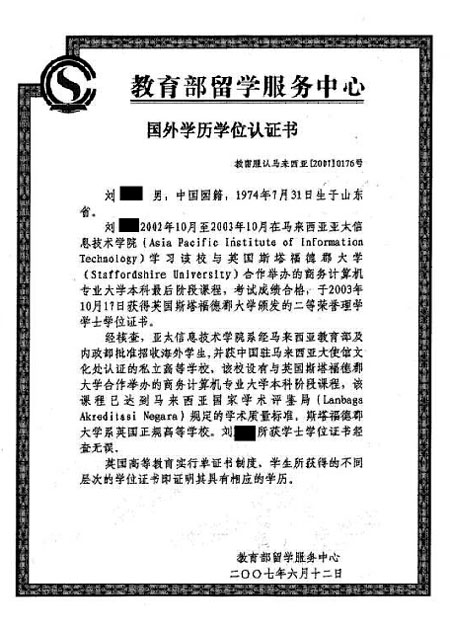 在马来西亚获得的英国学位证书