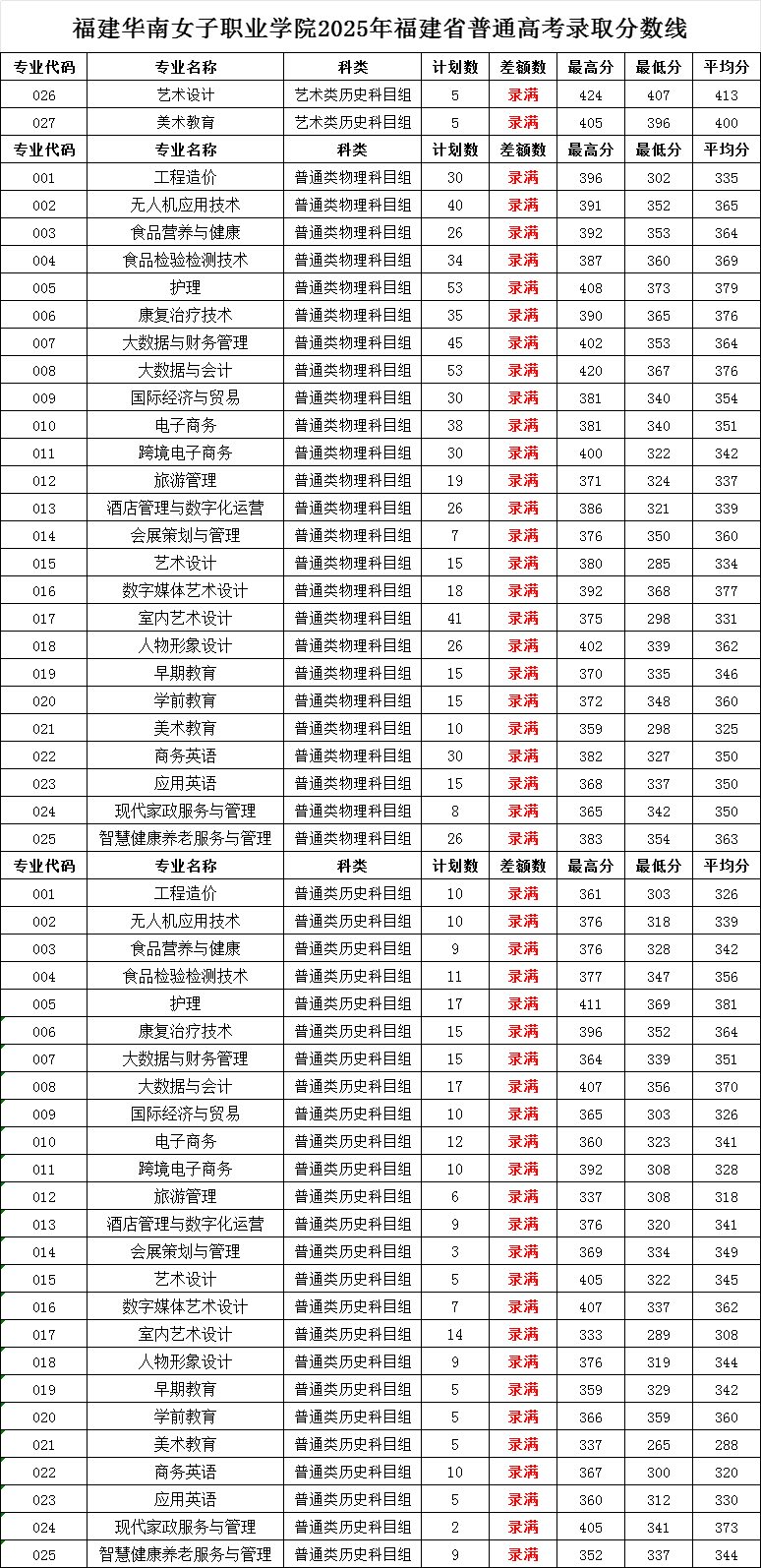 福建华南女子职业学院2025年福建省普通高考录取分数线