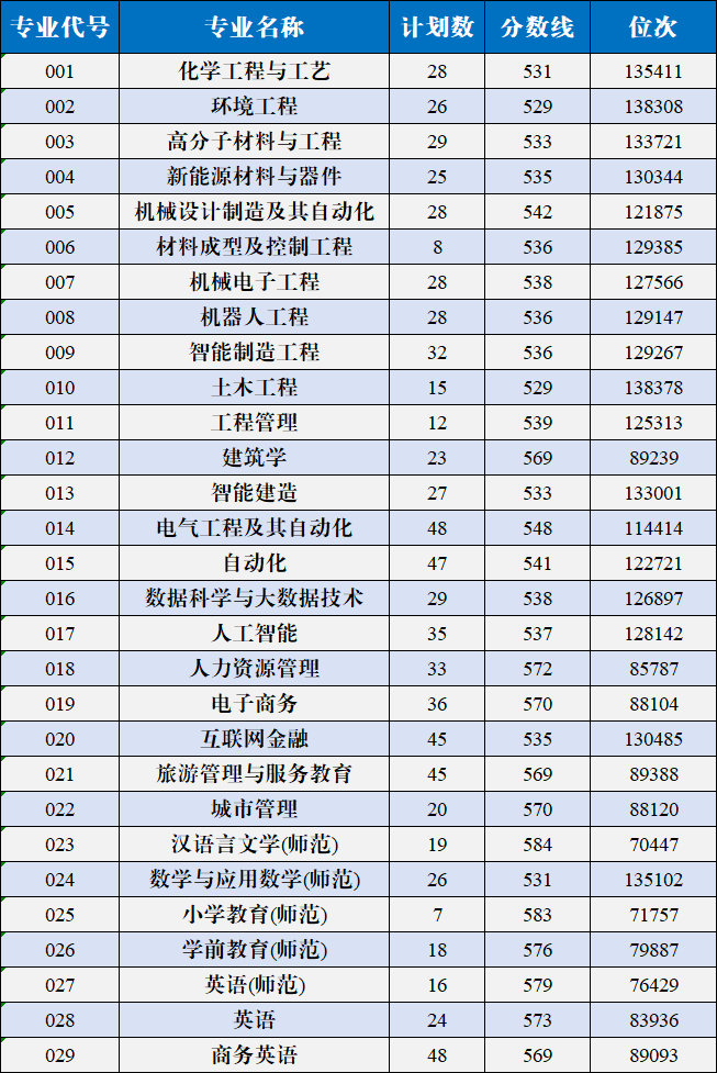在普通类平行录取中,本科专业录取最高分589分,最低分529分,录取最低位次比2024年提升40731位。与此同时,理工类专业生源质量提升明显,化学工程与工艺、环境工程、高分子材料与工程、新能源材料与器件、机械设计制造及其自动化、材料成型及控制工程、机械电子工程、机器人工程、智能制造工程、土木工程、电气工程及其自动化、自动化、数据科学与大数据技术、人工智能、数学与应用数学(师范)等15个本科专业录取最低位次比2024年有所提升,其中3个专业录取最低位次提升幅度超过20000位,最高提升幅度达44007。