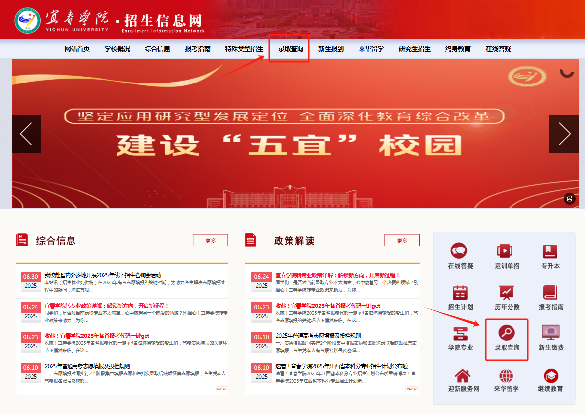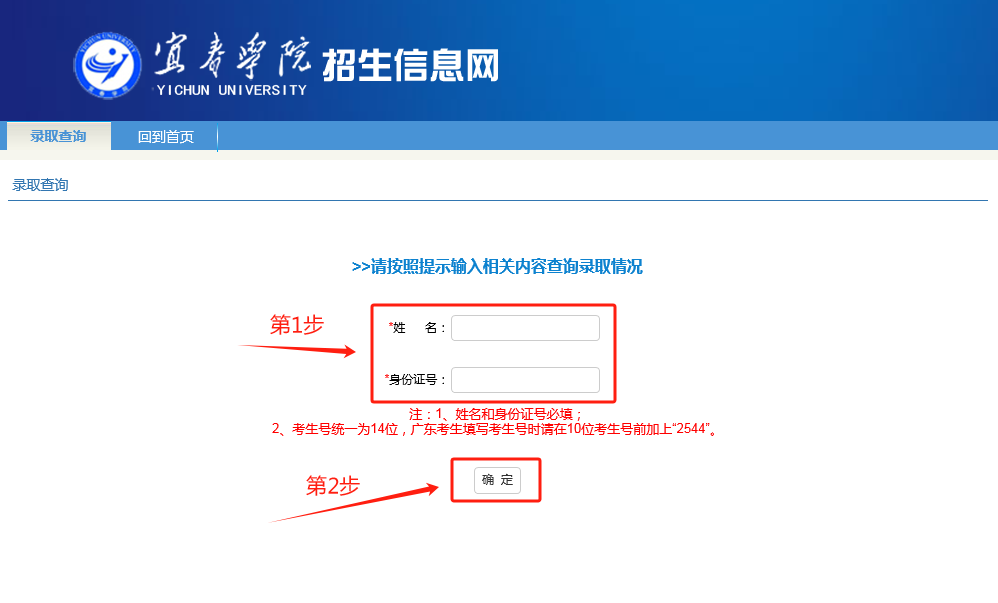 登录宜春学院招生信息网(网址为http://zsw.jxycu.edu.cn/zsw/),点击“录取查询”栏目的“普通高考录取查询”(或首页右侧的“录取查询”图标),打开查询页面后输入“考生姓名”和“身份证号码”即可查询。