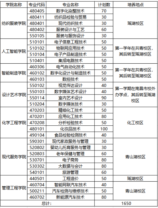 学校现有瑶湖、青山湖、高新、化工校区和共青产教融合基地、峡江产业学院。设有纺织服装学院、智能制造学院、人工智能学院、设计艺术学院、现代服务学院、管理工程学院、化学工程学院等7个二级学院,开设有40余个高职专业。其中国家现代学徒制试点专业1个,省级高水平专业群2个,省级“双高计划”优势特色专业2个,省级高职高专示范性专业4个。