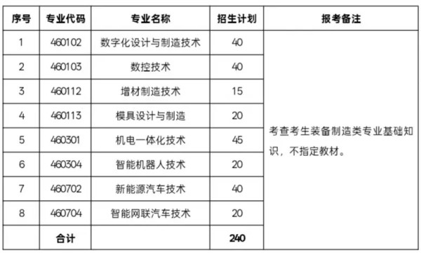 技能校考测试科目为装备制造类《职业技能》,招生计划为240名。