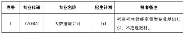 技能校考测试科目为财经商贸类《职业技能》,招生计划为50名。