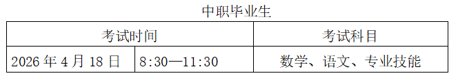 2、中职毕业生:考试方式为笔试。文化基础课(数学100分、语文100分)、专业技能200分,总分400分。