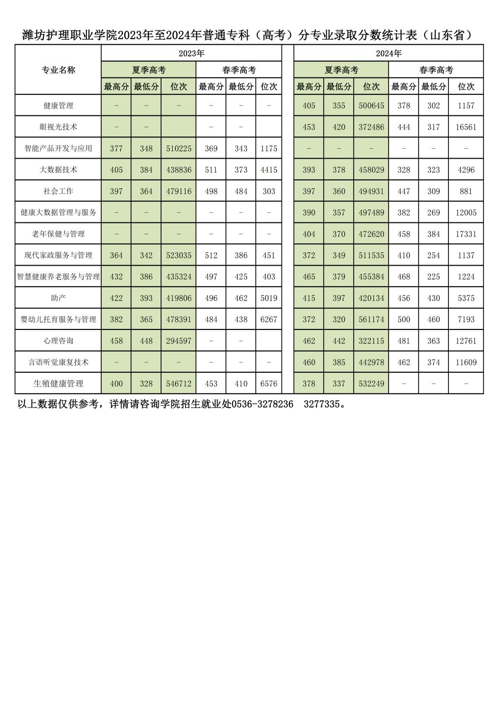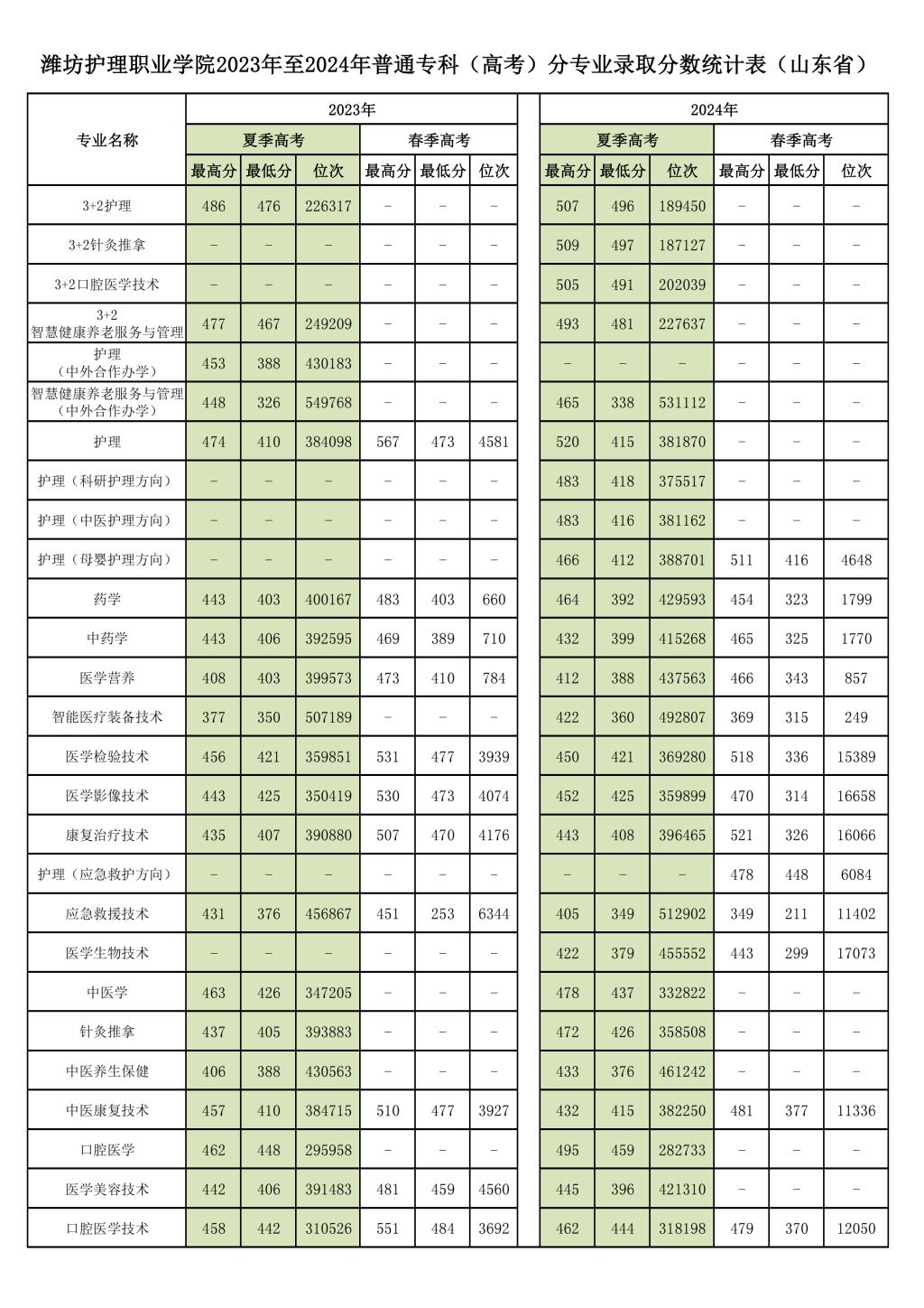潍坊护理职业学院2023年至2024年普通专科(高考)分专业录取分数统计表(山东省)
