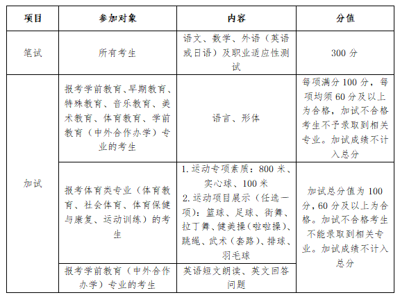 1.校测对象:所有填报我校志愿的考生均须参加校测笔试,其中报考师范类专业(早期教育、学前教育、特殊教育、音乐教育、美术教育、体育教育、学前教育(中外合作办学))、体育类专业(体育教育、社会体育、体育保健与康复、运动训练)和学前教育(中外合作办学)专业的考生须参加专业加试,艺术类考生的专业省统考成绩计入总分。