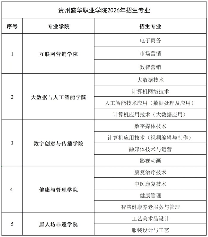 学校在“授之以鱼不如授之以渔”模式下,以“创新职业教育、实现教育与产业扶贫”为目标,设置了互联网营销学院、大数据与人工智能学院、数字创意与传播学院、健康与管理学院、唐人坊非遗学院等二级学院。学校开设了市场营销、人工智能数据工程技术、大数据技术、康复治疗技术、智慧健康养老服务与管理、服装与服饰设计等20余个社会热门、市场紧缺型专业,培养了很多年收入超百万的人才精英。
