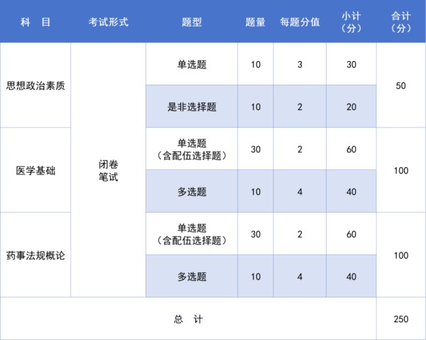 技能校考分为思想政治素养、专业理论、技术能力测试,采用一份总试卷,以闭卷、笔试形式进行,考试时长120分钟。科目为思想政治素养(50分)、医学基础(100 分)、药事法规概论(100分),共250分。