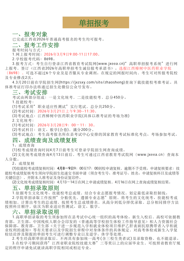 江西樟树中医药职业学院2026年单招招生简章