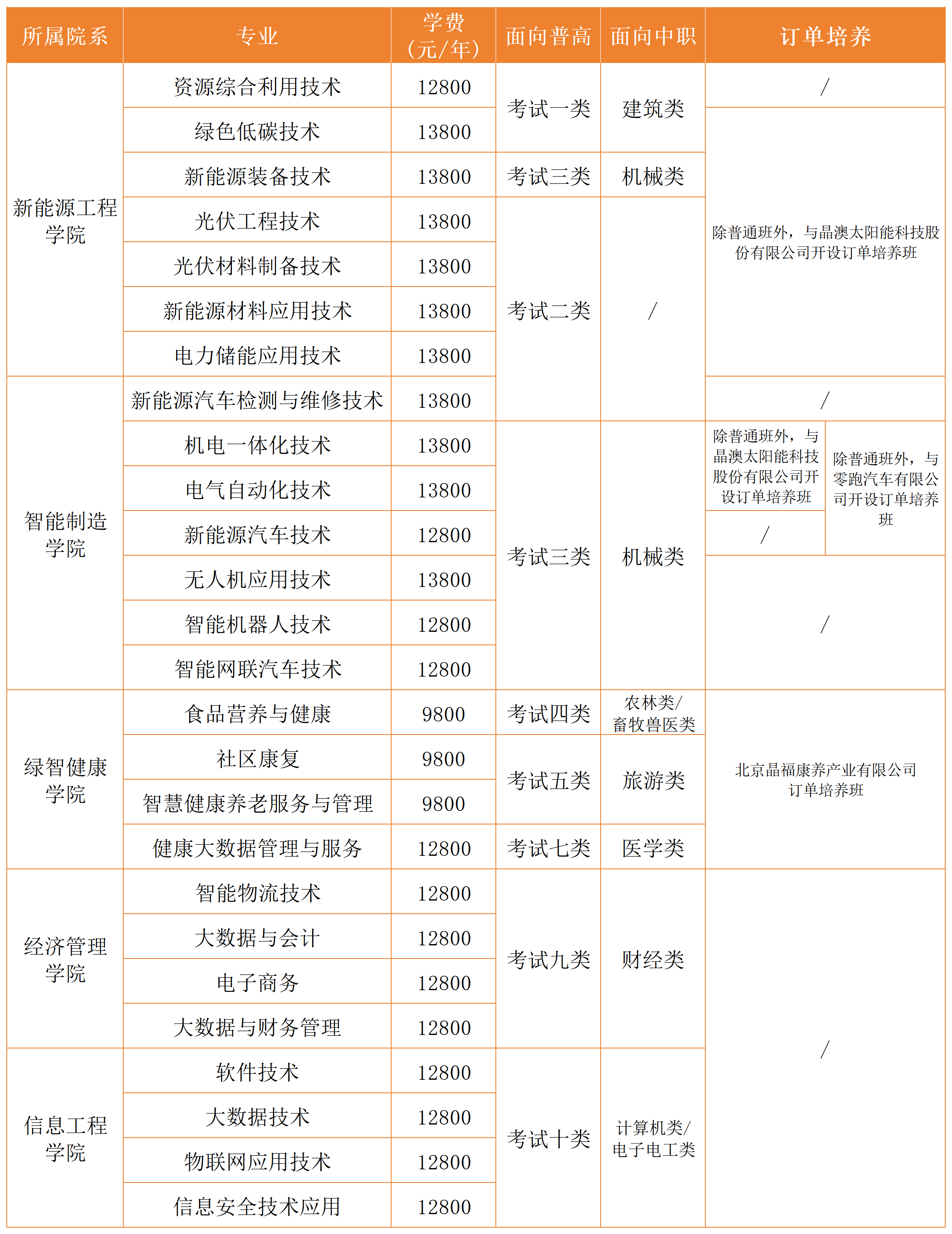 学费:食品营养与健康、社区康复、智慧健康养老服务与管理专业学费为 9800元/年;资源综合利用技术、新能源汽车技术、大数据与会计、电子商务、软件技术、大数据技术、物联网应用技术、信息安全技术应用、健康大数据管理与服务、智能机器人技术、智能网联汽车技术、智能物流技术、大数据与财务管理专业学费为12800元/年;绿色低碳技术、新能源装备技术、光伏工程技术、光伏材料制备技术、新能源材料应用技术、新能源汽车检测与维修技术、机电一体化技术、电气自动化技术、无人机应用技术、电力储能应用技术专业学费为13800元/年。