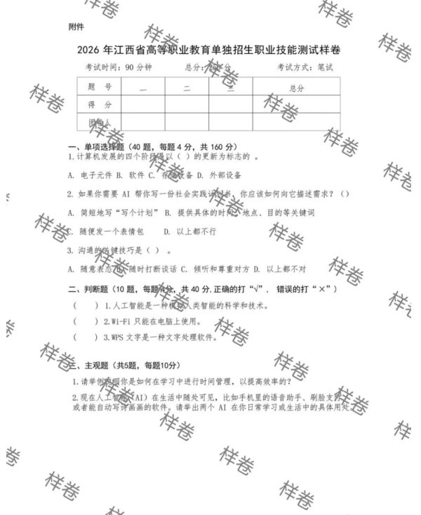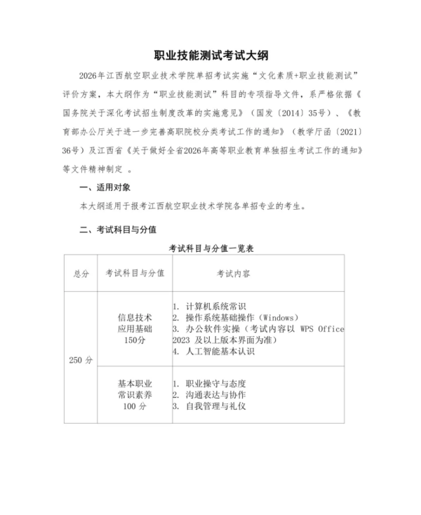 为了贯彻落实江西省教育厅《关于做好全省2026 年高等职业教育单独招生考试工作的通知》(赣教考字〔2025〕24号)的要求,江西航空职业技术学院2026年单独招生技能校考以职业技能测试方式进行,为便于报考者充分了解测试的要求与范围,特制定本考试大纲。