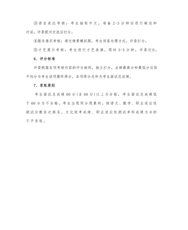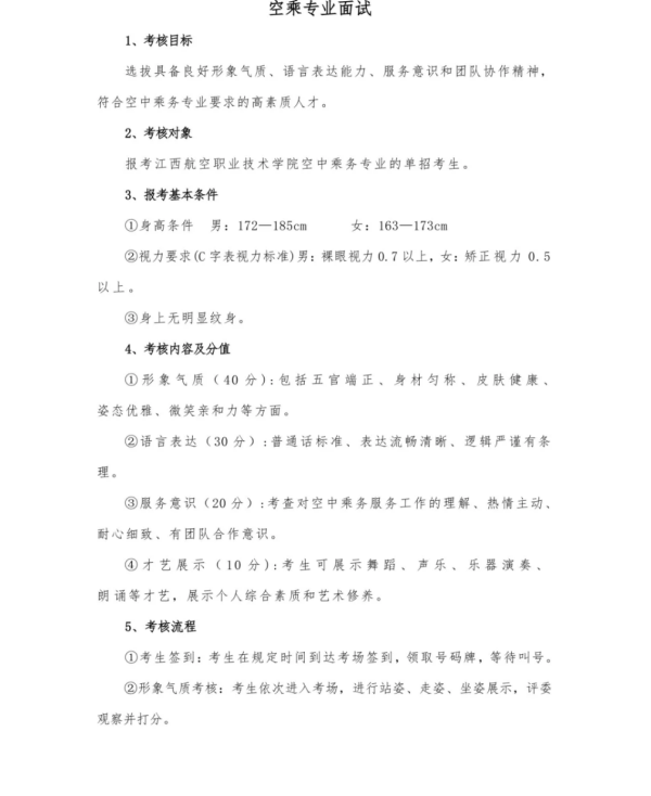 (2)空中乘务专业面试:满分100分,面试成绩不计入笔试总成绩,仅作为是否合格的参考依据。