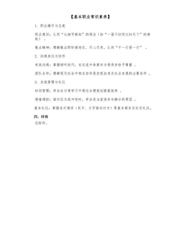 职业技能测试分为专业理论和技术能力测试两部分,测试内容将信息技术应用、通用技术应用、职业适应能力等融为一体。其目的是测试考生应具备的基本品质和应知、应会的基础知识、基本方法的水平以及分析问题、解决问题的能力。