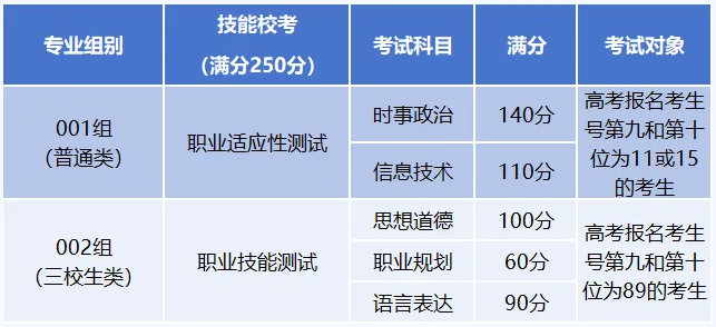 3.当总分(文化统考+技能校考)相同时,普通类考生(高考报名考生号第九和第十位为11或15的考生)依次按语文、数学、时事政治、信息技术成绩确定先后顺序;三校生类考生(高考报名考生号第九和第十位为89的考生)依次按语文、数学、思想道德、语言表达、职业规划成绩确定先后顺序。