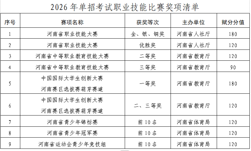 凡获得由省级招委会确定的统测项目范围内的国家二级运动员以上称号的考生,或符合“2026年单招考试职业技能比赛奖项清单”中获奖赛项之一的考生,可在规定时间内填写《安阳职业技术学院2026年优秀技能人才赋分申请表》(详见附件1),提出赋分申请,由考生所在学校负责确认考生获奖情况。
