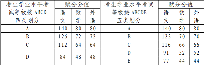 能够提供普通高中学业水平考试成绩的考生,文化素质考试成绩原则上采用普通高中学业水平考试成绩替代,按照语文、数学、外语三科的普通高中学业水平考试等级进行赋分,其中语文满分140分,数学满分80分,外语满分80分,具体赋分办法如下: