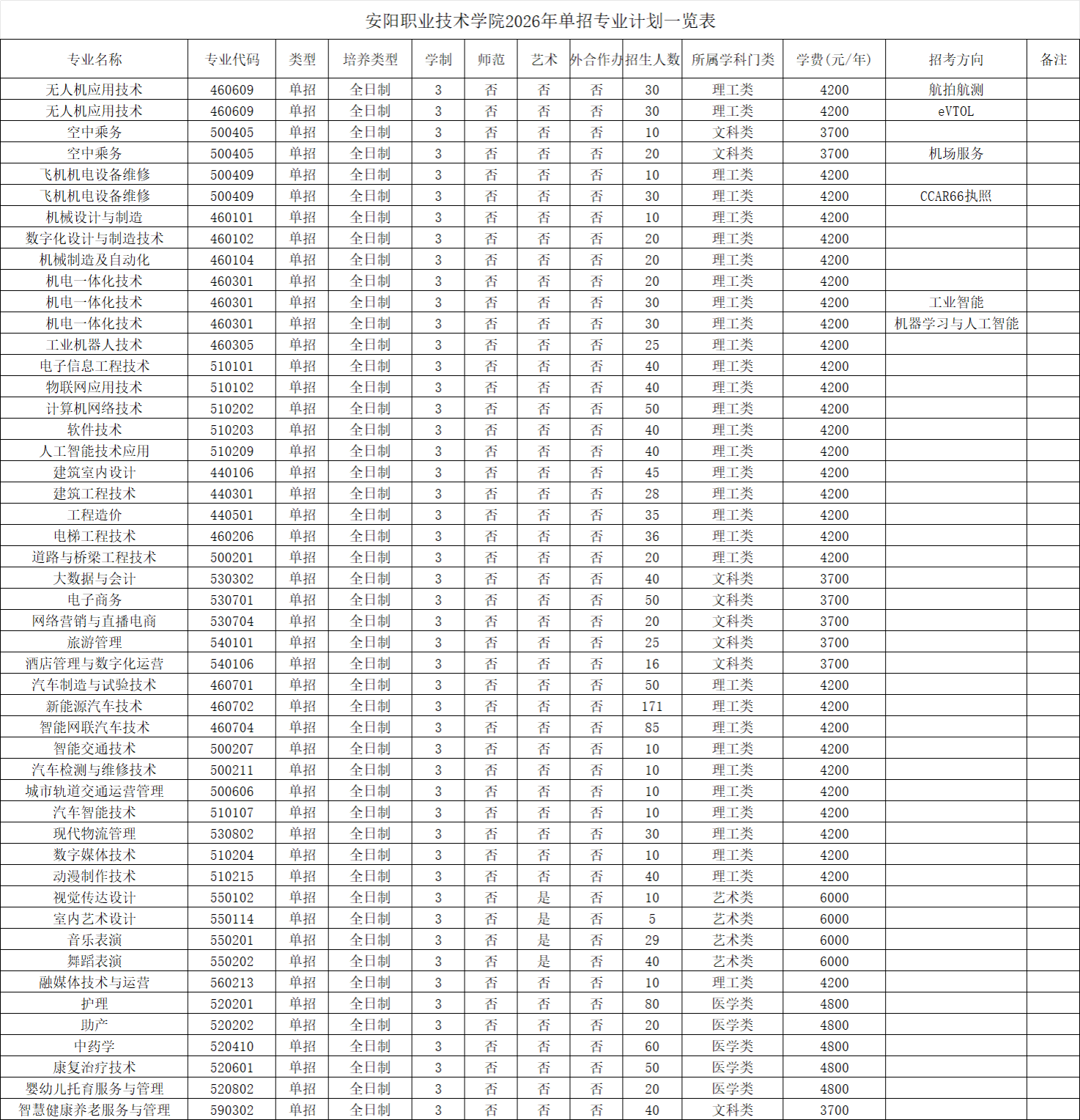 第六条 2026年单独考试招生专业为土木建筑类、装备制造类、交通运输类、电子与信息类、医药卫生类、财经商贸类、旅游类、表演艺术类、艺术设计类、新闻传播类等,总计划1600人,分专业计划经审核确认后,通过各种渠道向社会公布。