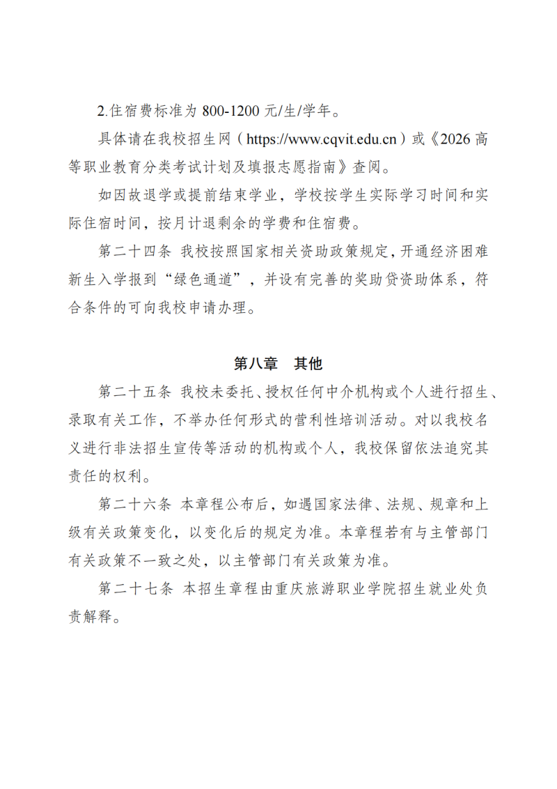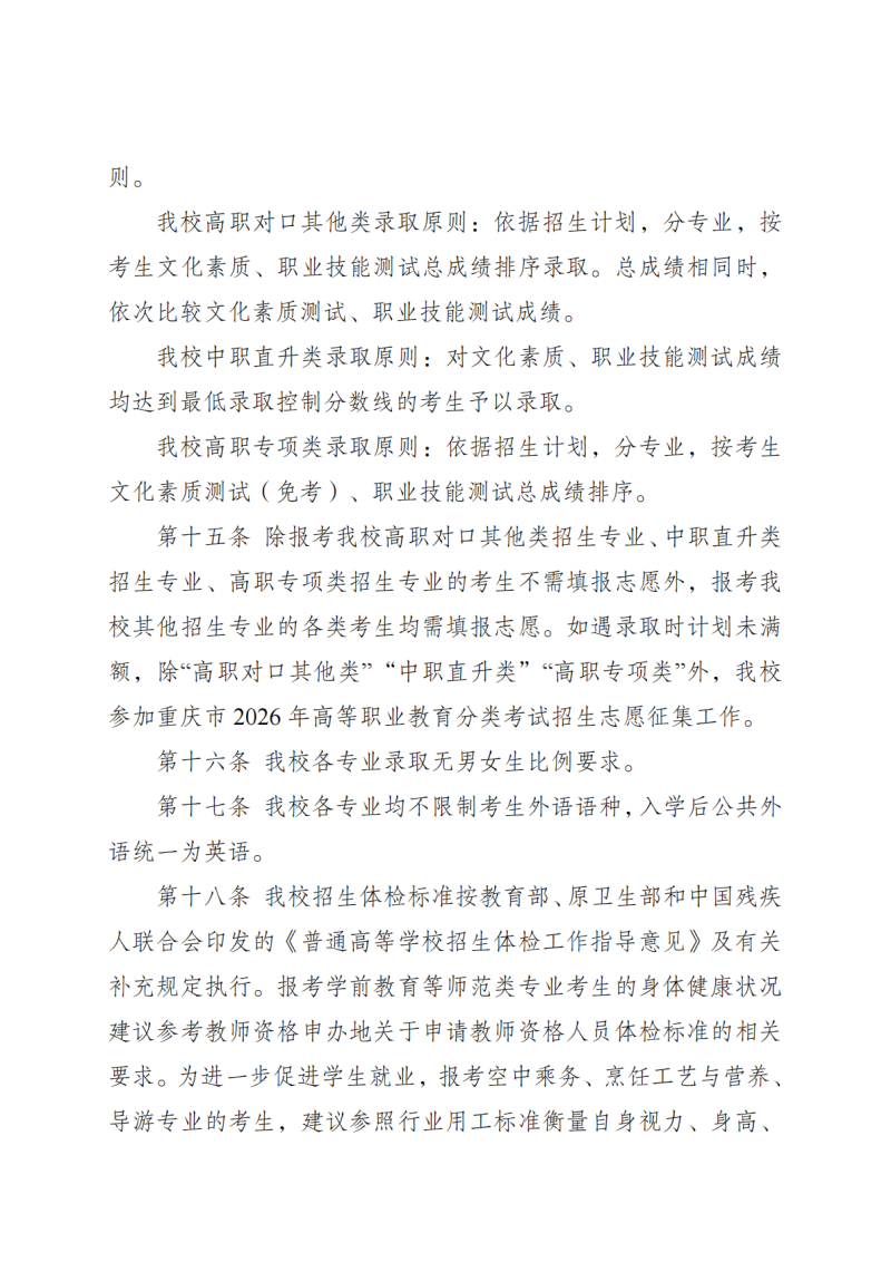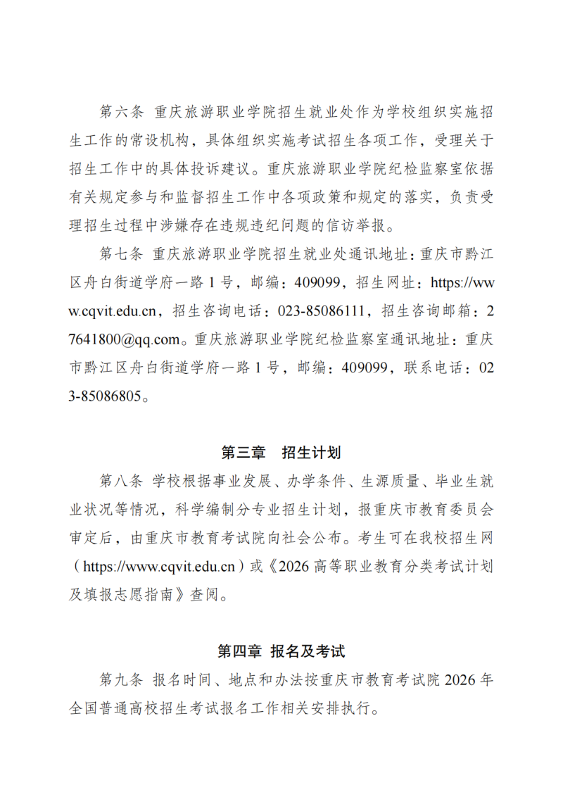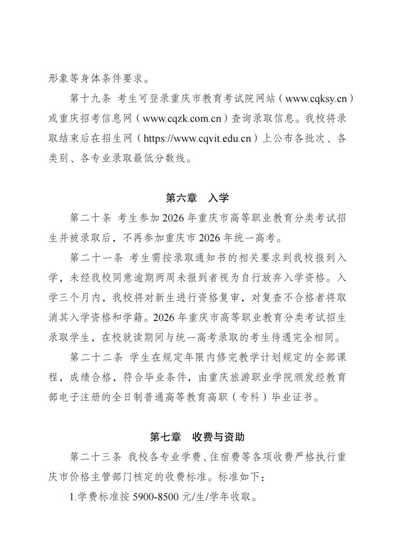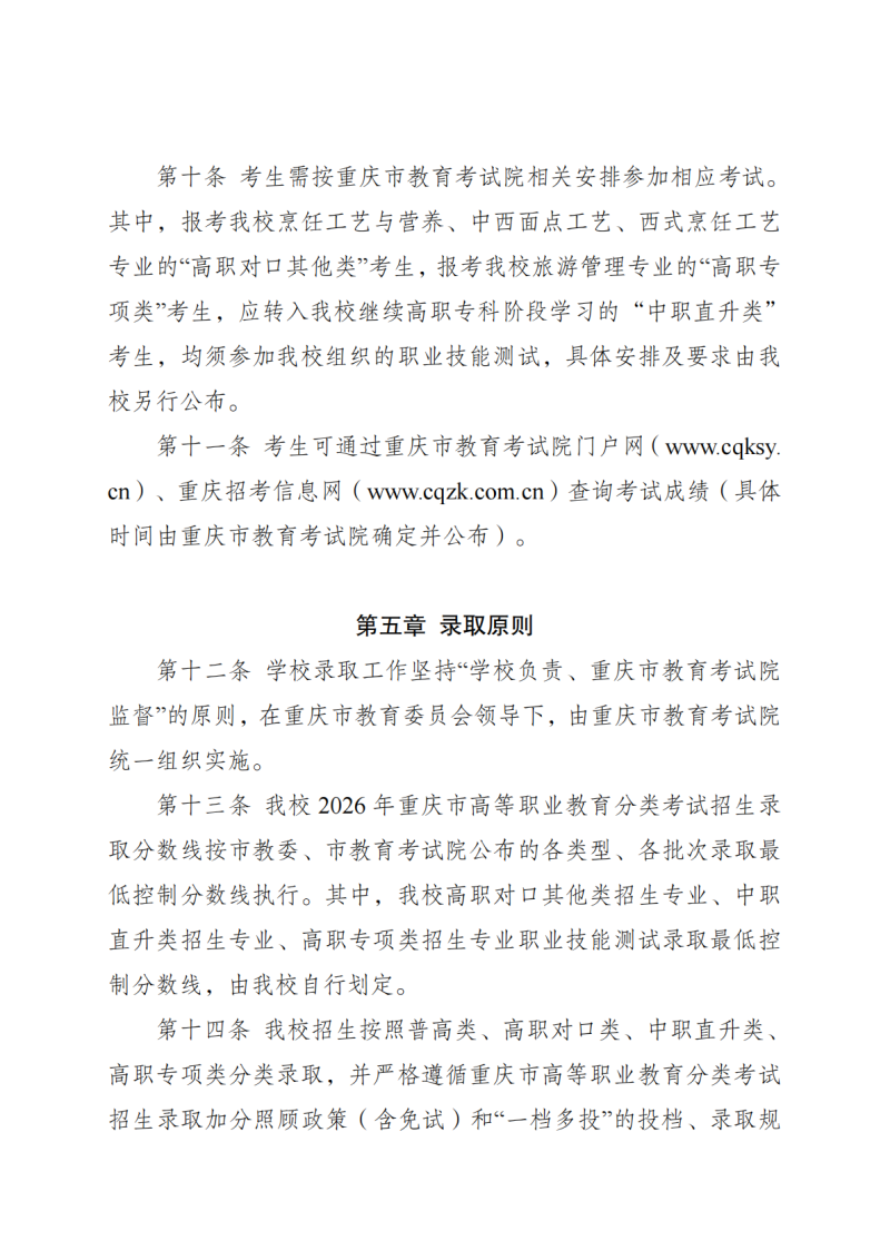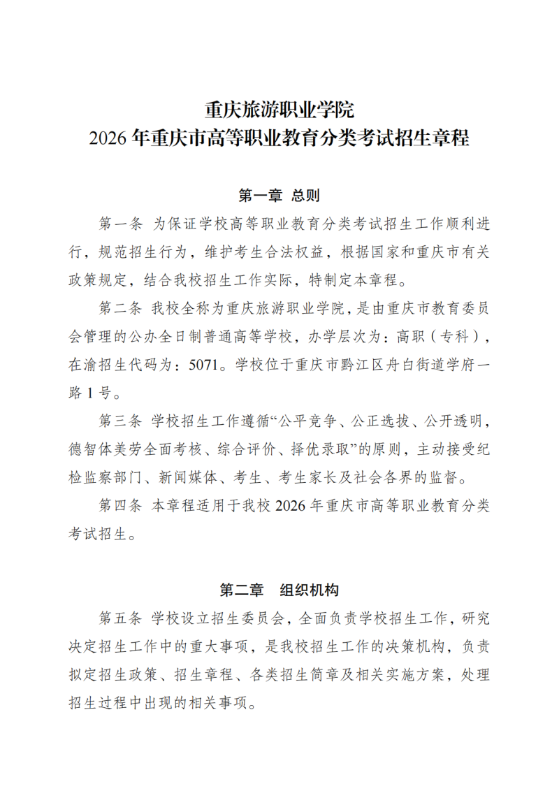 重庆旅游职业学院2026年重庆市高等职业教育分类考试招生章程