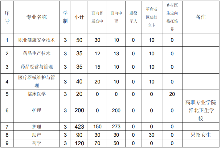 2.淮北卫生学校(公办)办学地址:安徽省淮北市烈山区沱河东路(注:高职专业学院录取学生在联合培养学校就读,不接受转专业。)