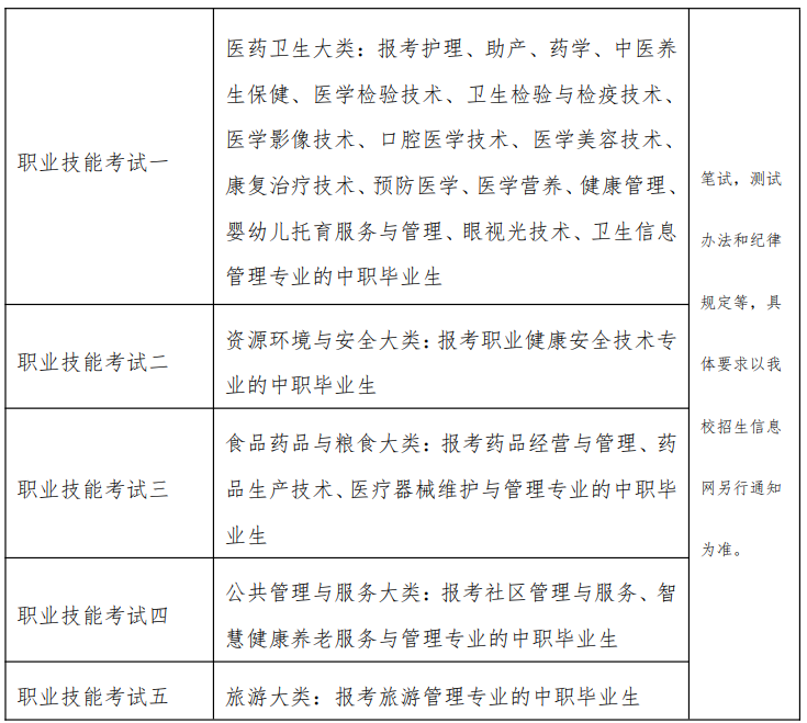 分类考试招生实行“文化素质+职业技能”的考试评价方式。文化素质测试由省考试院统一组织并划定合格分数线。文化素质测试合格者,中职学校、中等技工学校毕业生参加我校组织的职业技能考试,其他考生参加我校组织的职业适应性测试;报考乡村医生定向的临床医学专业所有考生参加我校组织的乡村医生定向职业适应性测试。