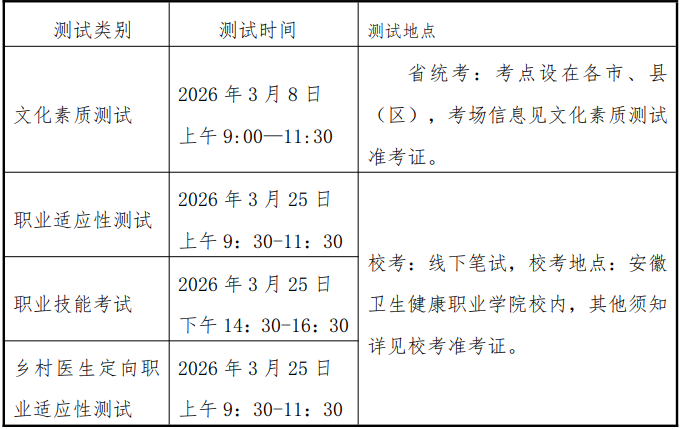(一)填报时间参加全省统一组织的文化素质测试且成绩合格的考生,于 2026 年 3 月 14 日 10:00 至3 月17 日17:00登录3gkbm.ahzsks.cn 填报院校与专业志愿。单独参加乡村医生定向委托培养计划报名的考生,无需参加省考试院组织的志愿填报。省卫生健康委核准各市报送报名初审通过考生名单后,由省考试院统一导入志愿信息。考生参加乡村医生定向委托培养计划报名的同时,还有意兼报其他院校其他专业的,可按照2026 年分类考试和对口招生工作实施办法,在规定时间内填报其他院校(专业)志愿,志愿填报办法与其他考生相同。