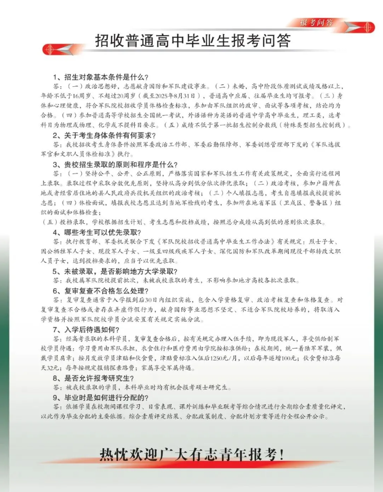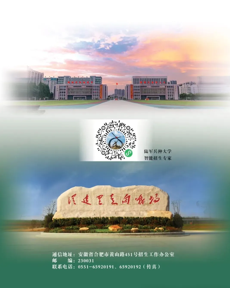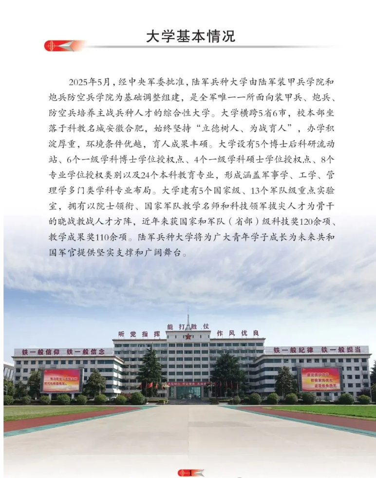 大学横跨5省6市,校本部坐落于科教名城安徽合肥,始终坚持“立德树人、为战育人”,办学积淀厚重,环境条件优越,育人成果丰硕。大学设有5个博士后科研流动站、6个一级学科博士学位授权点、4个一级学科硕士学位授权点、8个专业学位授权类别以及24个本科教育专业,形成涵盖军事学、工学、管理学多门类学科专业布局。大学建有5个国家级、13个军队级重点实验室,拥有以院士领衔、国家军队教学名师和科技领军拔尖人才为骨干的晓战教战人才方阵,近年来获国家和军队(省部)级科技奖120余项、教学成果奖110余项。陆军兵种大学将为广大青年学子成长为未来共和国军官提供坚实支撑和广阔舞台。