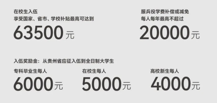 (九)贵州省服兵役高等学校学生国家教育资助:国家对应征入伍服义务兵役、招收为士官的高校学生,实行学费一次性补偿、学费减免或用于学费的国家助学贷款实行代偿。每生每年最高不超过12000元。