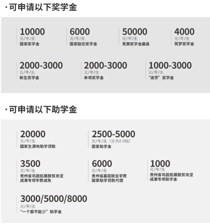 (三)贵州省巩固拓展脱贫攻坚成果专项学生资助(原精准扶贫):贵州省户籍脱贫户子女享受贵州省巩固拓展脱贫攻坚成果专项学生资助4500元每生每年(含1.专项助学金,标准为1000元/每生每年;2.免(补助)学费,专科(高职)3500元每生每年)。