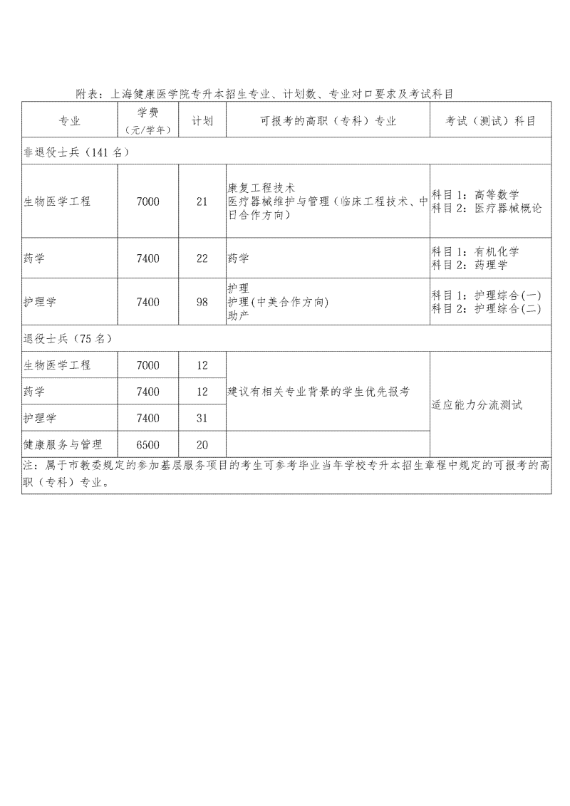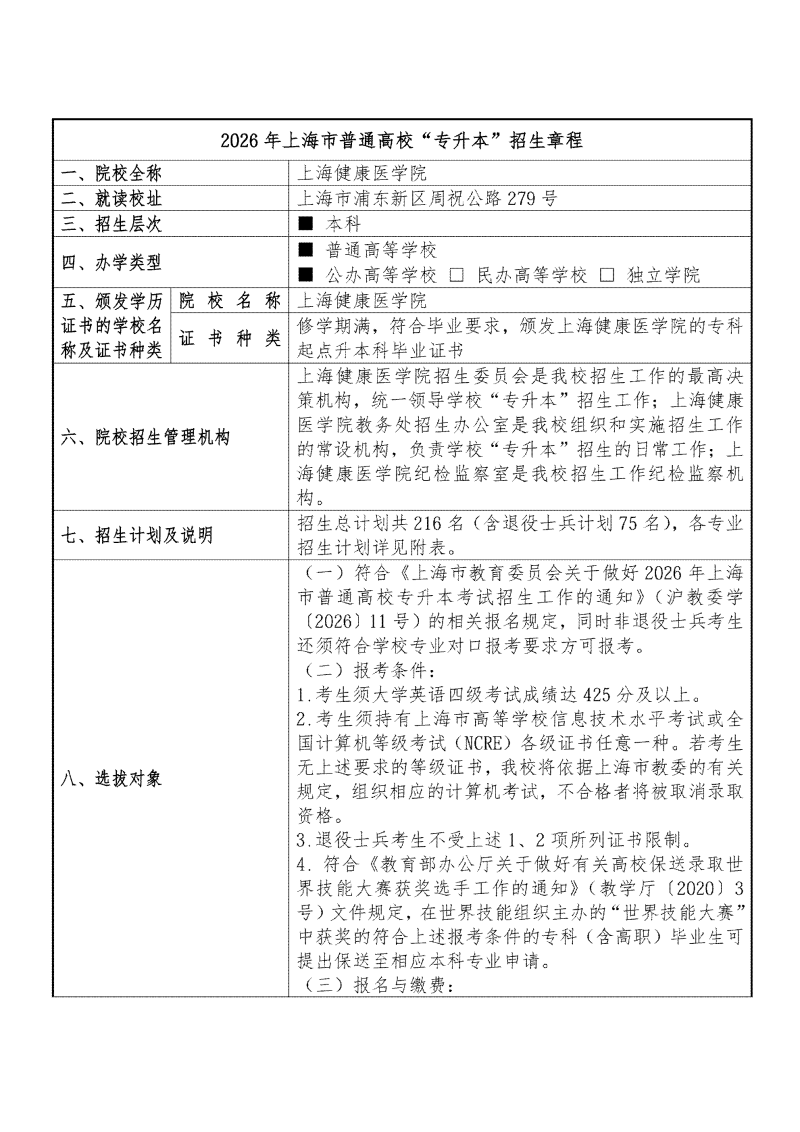 上海健康医学院2026年专升本招生章程