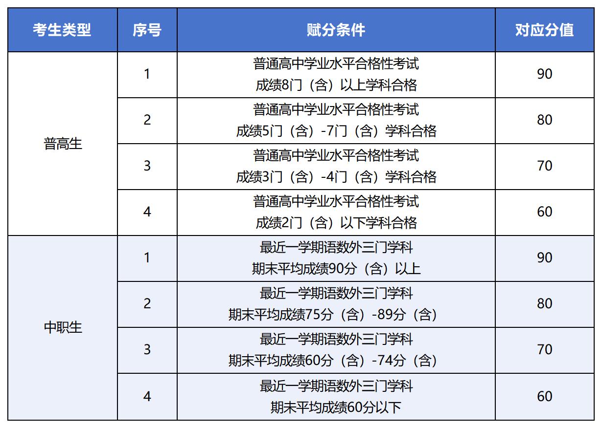 (1)初试成绩核算依据:学校不再组织初试,采取等级赋分的方式。主要参考普通高中学业水平合格性考试成绩或中等职业学校学生平时科目成绩。