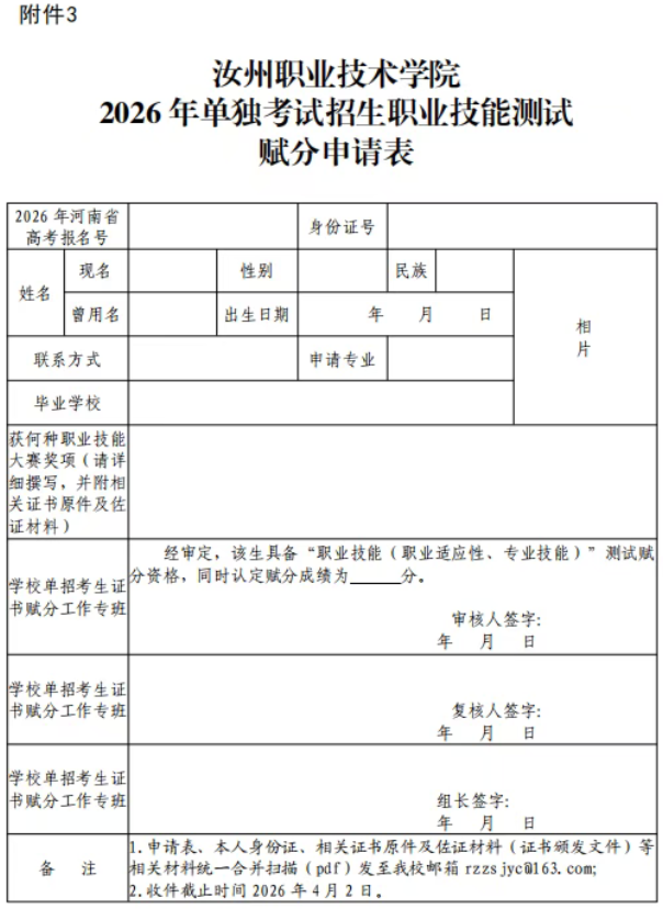 符合条件并提出申请的考生请于2026年4月1日至2日向汝州职业技术学院招生就业处邮箱(rzzsjyc@163.com)发送《汝州职业技术学院2026年单独考试招生职业技能测试赋分申请表》(见附件3)、本人身份证、相关证书原件及佐证材料(证书颁发文件),所有材料要求统一合并为PDF格式,逾期视为自动放弃。4月4日至5日,由学院高职单招工作领导小组工作专班审核确定是否给予申请人赋分。