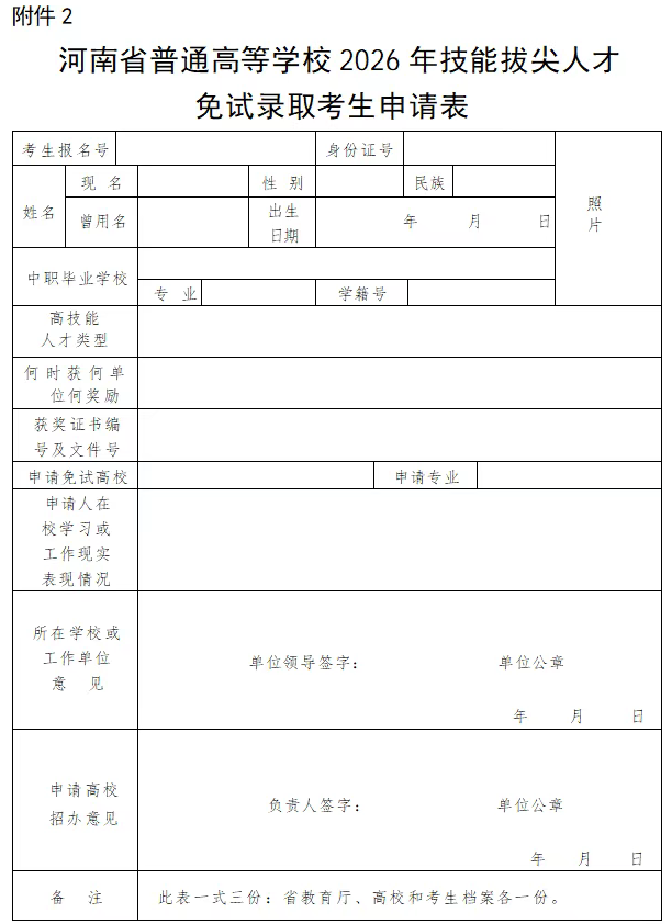 1.考生本人必须在规定时间内向我院提出免试入学申请并填写《河南省普通高等学校2026年技能拔尖人才免试录取考生申请表》(附件2),并提供身份证复印件、获奖证书或资格证书复印件等相关材料,由考生所在学校(生源学校)负责考生获奖情况的确认。