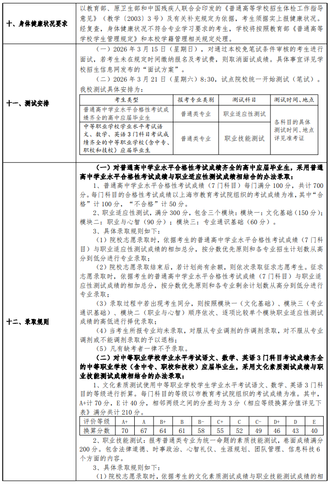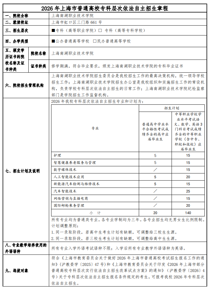 上海南湖职业技术学院2026年专科层次依法自主招生章程