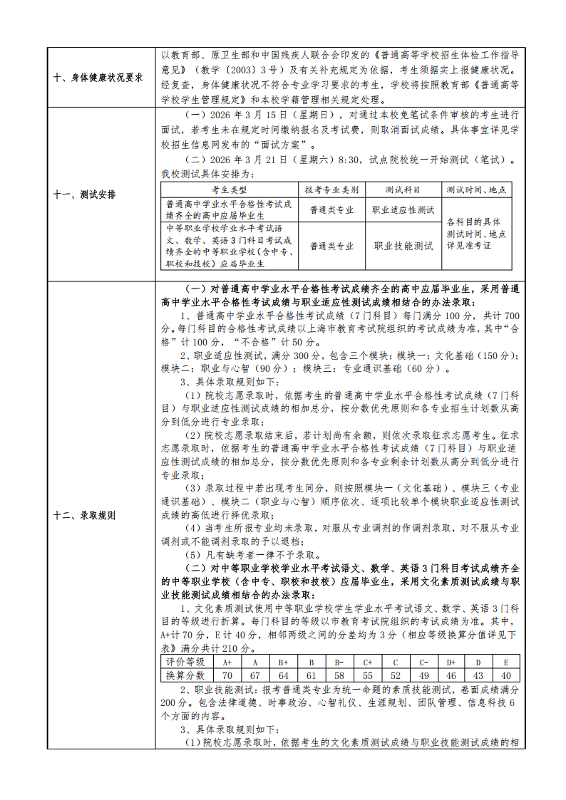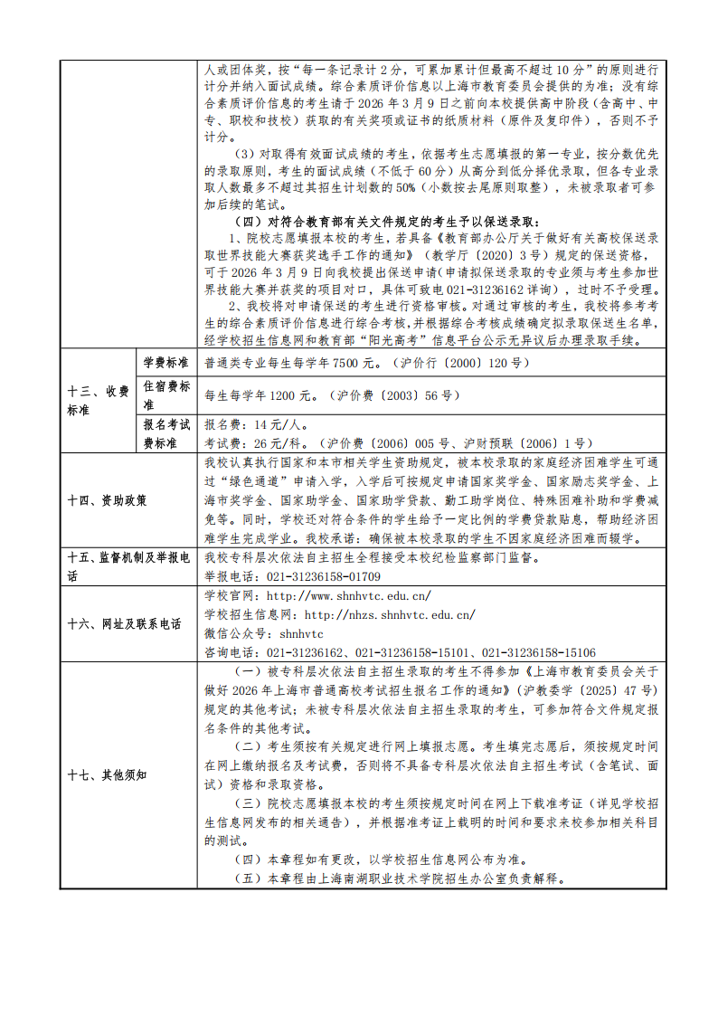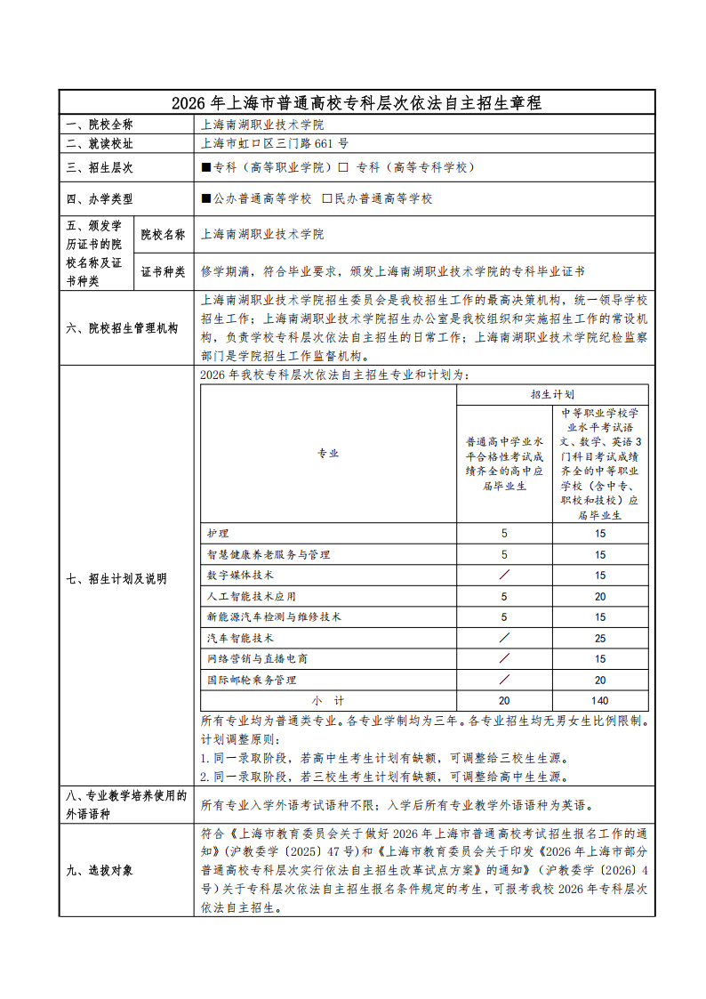 上海南湖职业技术学院2026年专科层次依法自主招生章程